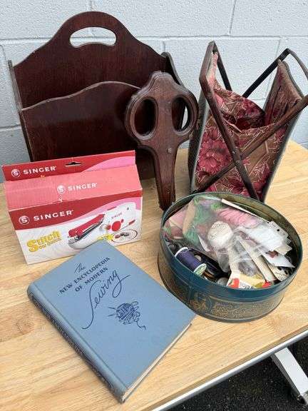 Everything you need to stitch and style! Includes Singer Stitch Sew Quick kits, a folding fabric sewing caddy, wooden holders (including one shaped like oversized scissors!), a tin of assorted notions, and a copy of The New Encyclopedia of Modern Sewing. A great grab for makers and menders. See photos for condition and contents.
