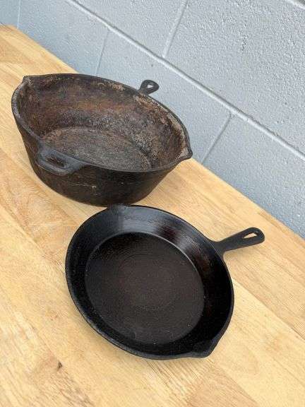 Two cast iron pans—one deep Dutch oven-style and one skillet. Great candidates for restoration or rustic display. See photos for details on condition/measurements or other applicable information.
