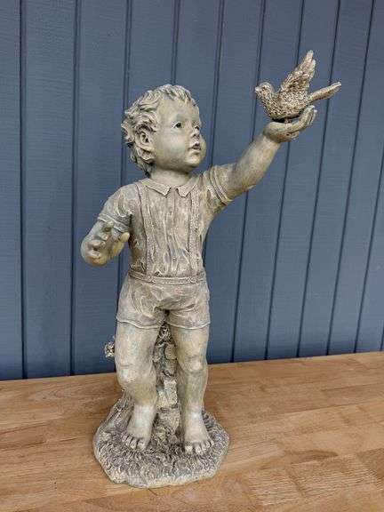 A charming garden statue depicting a young boy holding a bird. Made of a resin type material, this statue stands approximately 21 inches tall. The bird appears to have a repair.