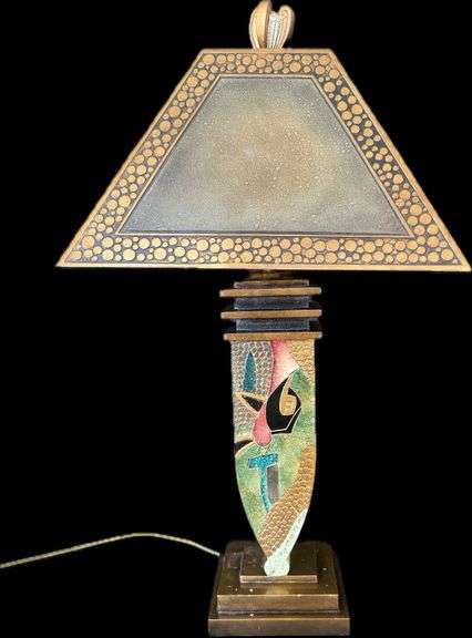 Enhance your space with this striking table lamp. It features a pyramid shade with a decorative pattern and an eye-catching base with a unique design. This lamp is sure to add a touch of artistic flair to any room. Untested.