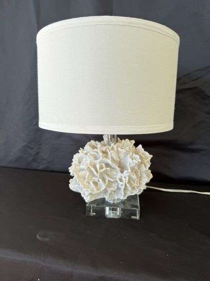 Invite the ocean's serene beauty into your home with this unique coral-inspired table lamp. The textured base evokes the intricate forms of natural coral, complemented by a crisp white shade. Perched atop the shade hardware is a delicate seashell accent, adding a touch of coastal whimsy. Resting upon a clear, square base, this lamp elevates any space with its understated elegance and luminous charm. Untested.