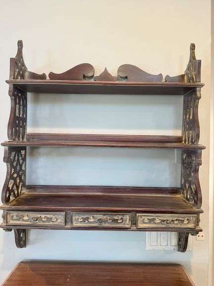 DescriptionElevate your space with this unique wooden wall shelf. This striking piece features three tiers, ornate detailing, and three charming drawers, perfect for adding both character and functionality to any room. Imagine this beauty displaying your favorite books, plants, or trinkets.