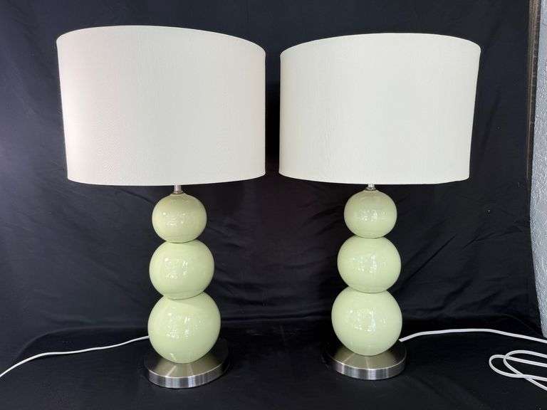 Illuminate your space with this lively pair of lamps. Each lamp features a stack of three pistachio green spheres atop a circular base, supporting a crisp drum shade. These lamps are sure to add a touch of whimsy to any room. Untested.
