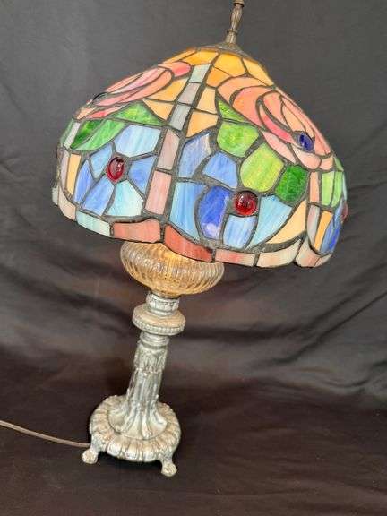 This beautiful table lamp features a vibrant stained glass shade decorated with a floral design. The shade sits atop an ornate silver-toned base. Tested for power.