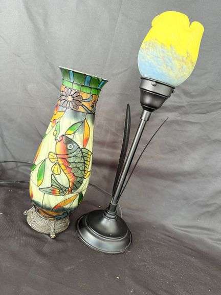 Add a touch of artistry to your living space with this charming pair. First, a delightful flower lamp with a yellow and blue bloom. Accompanying this is a vase adorned with colorful fish designs, a perfect complement to any decor. Tested for power.