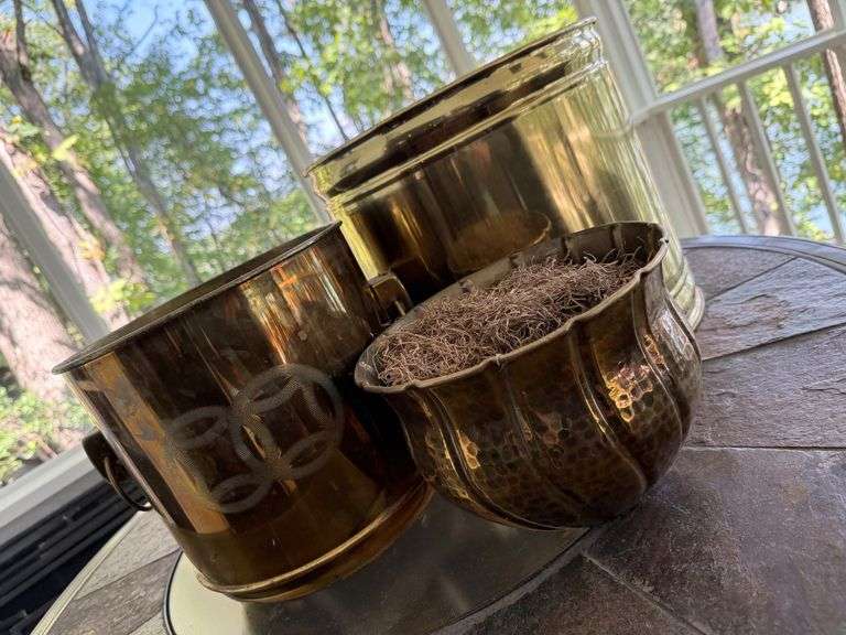 Elevate your greenery with this eye-catching trio of brass planters. The set includes one large cylindrical planter and one smaller bucket planter with handles and a decorative logo. Also included is a smaller hammered planter.