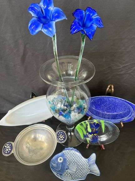 DescriptionEclectic grouping of decorative art pieces! This auction includes a glass vase, a pair of blue glass flowers, a white fish-shaped serving dish, a blue and white fish-shaped serving dish, a round glass plate with blue flowers, a mottled blue dish, and a metal dish with blue and white accents. Each with it's own flair, this bundle is sure to contain a piece that calls to you!