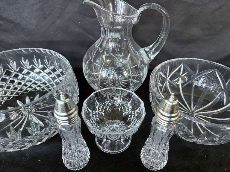 DescriptionA curated selection of sparkling crystal pieces to add a touch of refined elegance to your table. This collection features a beautiful pitcher, two bowls, a small dish, and a pair of charming salt and pepper shakers. Each piece boasts intricate patterns, catching the light and creating a dazzling display.