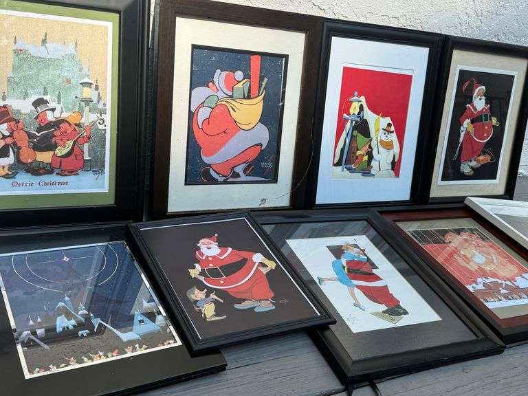 You are bidding on a collection of framed pictures, each featuring a depiction of Santa Claus. There are 8 pictures in the collection, all are framed in a similar style. These festive artworks are sure to bring holiday cheer to any space.