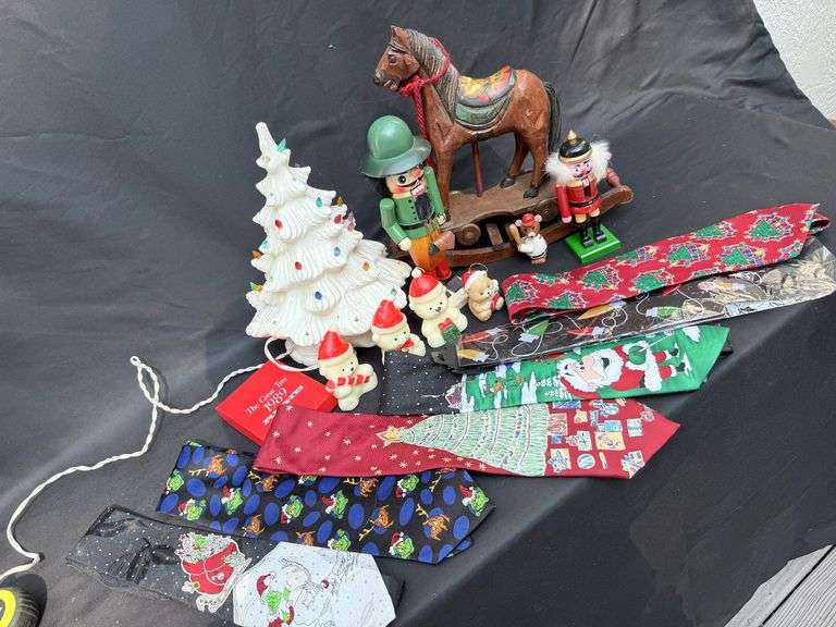 DescriptionDelight in the spirit of the season with this charming collection! A wooden rocking horse with rustic character stands alongside jolly nutcrackers, cheerful bear ornaments, and a twinkling ceramic Christmas tree. Festive neckties complete this whimsical holiday ensemble.