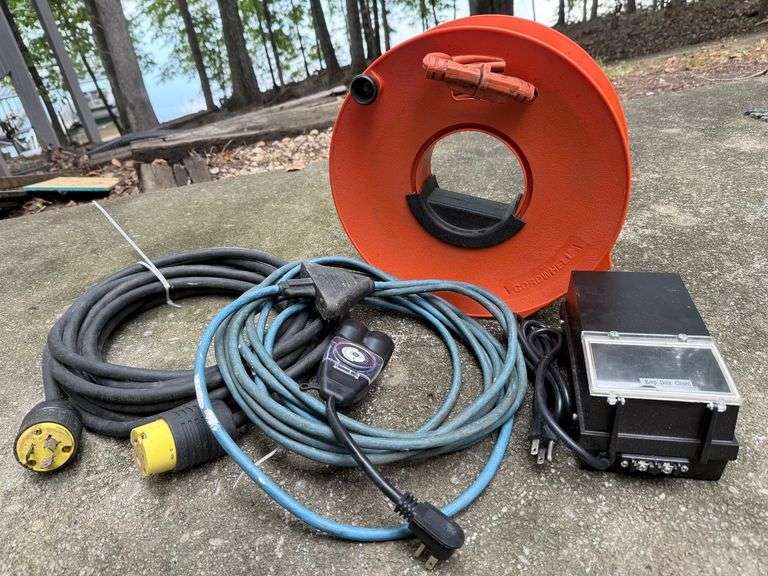 Power up your outdoor projects with this collection of electrical essentials! You'll receive a Cordwheel with an extension cord, a second extension cord with a heavy-duty plug, a GE timer with two outlets, and a power box with controls. Everything you need to keep your lights, tools, or decorations running smoothly! Untested.