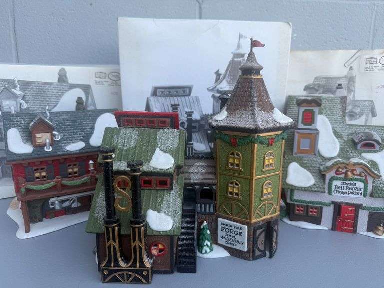 Dept 56, North Pole Series, Elgin Forge & Assembly Shop, Santa's Woodworks and Santa's Bell Repair. Hand painted porcelain.