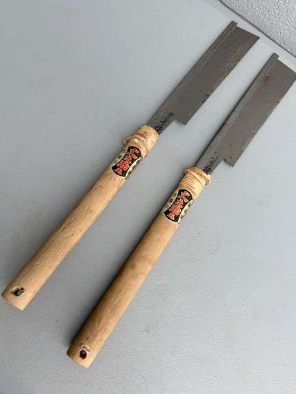 Pair of traditional Japanese pull saws (nokogiri) with wooden handles and fine steel blades. Designed for precise, clean cuts on the pull stroke, ideal for woodworking and joinery. Authentic craftsmanship with original maker labels intact. See photos for details on condition.