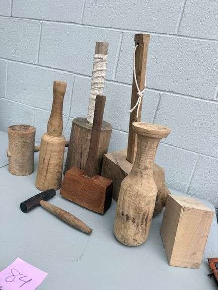 Here's a collection of wooden mallets, each a unique specimen handcrafted by a White County Woodright. These tools are perfect for woodworking, crafts, or even just adding a rustic touch to your workshop. One is not like the other, there's a variety of shapes and sizes in this lot. See photos for condition and details. These mallets are ready to get back to work!
