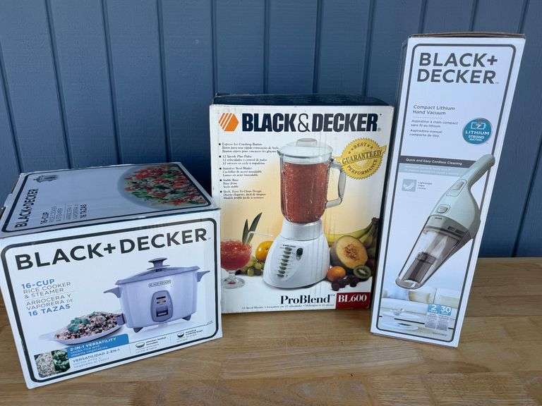 DescriptionHere's your chance to grab a trio of handy helpers! Feast your eyes on a Black & Decker blender, a 16-cup rice cooker, and a compact hand vacuum. A kitchen and cleaning dream team, all in one fell swoop! See photos for condition and details. NIB.