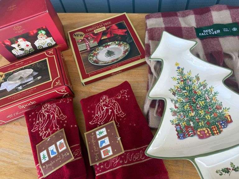 DescriptionGet ready to deck the halls (and your table!) with this festive collection! This lot includes a Spode Christmas Tree cranberry dish and server, a Christopher Radko Christmas Tree Traditions platter, a 2018 Spode Annual Collector Plate, Lenox Santa & Train salt and pepper set, red angel Christmas hand towels, and a festive scarf to wrap it all up in Christmas cheer. See photos for condition and details. Don't miss out on this treasure trove of holiday cheer!