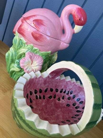 DescriptionBring a touch of the tropics to your kitchen with this delightful duo! First up, we have a fun flamingo cookie jar, complete with a flower and a sweet expression. Next, we have a charming watermelon bowl. Both pieces are sure to add a playful touch to any room. These ceramic items appear to be hand-wash only. See photos for condition and details.