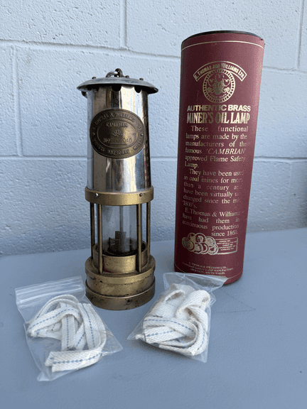 Authentic brass miner’s oil lamp by E. Thomas & Williams Ltd., made in Aberdare, Wales. This functional replica of the historic Cambrian flame safety lamp includes its original packaging and spare wicks. Beautifully crafted and polished—both a working lamp and a striking display piece celebrating over a century of mining heritage. See photos for details and condition.