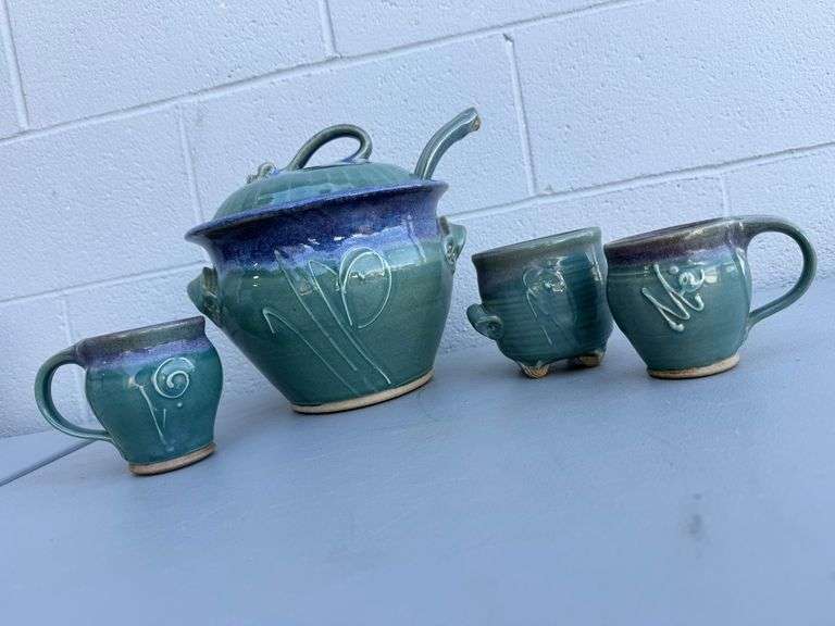DescriptionSoup's on! Well, it *could* be, if you win this pottery set handcrafted by Habersham County potter Jeanie Daves. Includes a soup tureen with lid and ladle, two matching mugs, and a French butter keeper (lid in lot 188). The set features a lovely blue-green glaze with purple accents, as well as artist details. The base of each item has markings. See photos for condition and details.
