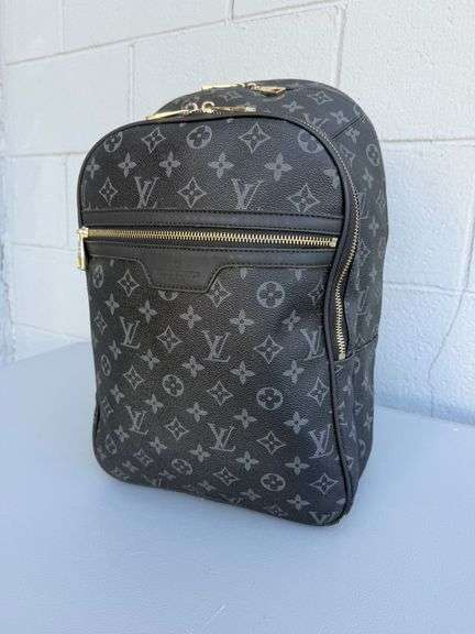 Louis Vuitton-style monogram backpack in classic dark canvas pattern with gold-tone zippers and trim. Features front zip pocket, spacious main compartment, and top handle. Stylish design with iconic look, though authenticity has not been confirmed. See photos for details on condition and markings.