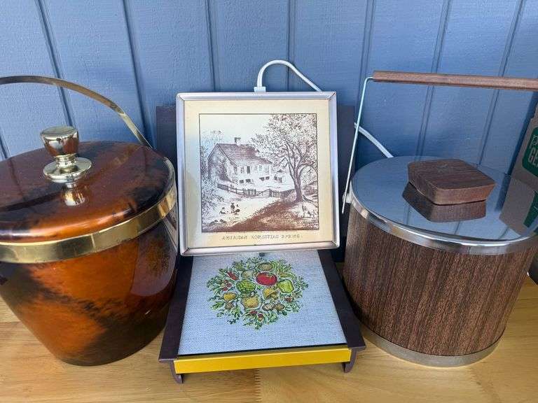DescriptionBehold, a curious assemblage of items! Two retro ice buckets, one in a groovy tortoise-shell finish and the other in handsome wood grain. And if that weren't enough, we've tossed in a framed print of a charming homestead scene, and a colorful trivet to boot! This lot has it all, from keeping your beverages icy cool to adding a touch of visual interest to your abode. See photos for condition and details.