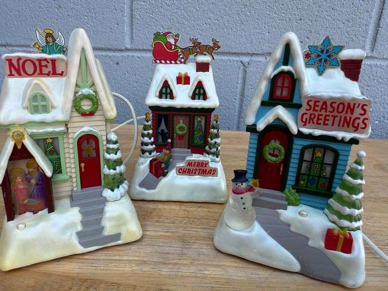 DescriptionGet ready to deck the halls with this festive set of light-up holiday homes! Each charming abode features a different seasonal message: "Noel", "Merry Christmas", and "Season's Greetings". These battery-operated decorations are ready to bring some cheer to your shelves, fireplace mantel, or wherever you want to spread some holiday spirit. See photos for condition and details.