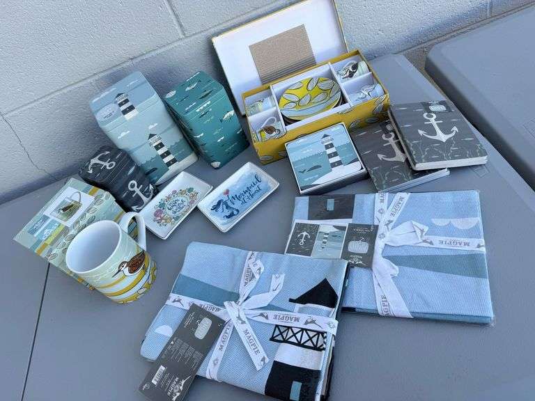 DescriptionAhoy there! Set sail for savings with this collection of nautical-themed goodies from Magpie. Included in this lot are sets of coasters, mugs, notebooks, tea towels, and more. Get ready to dive into a sea of style and bring the coast home! See photos for condition and details.