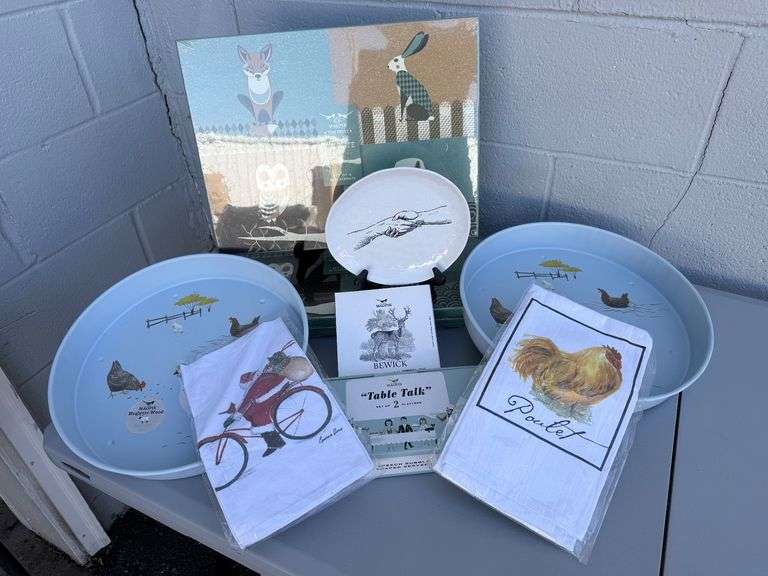 DescriptionStep right up and feast your eyes on this charming collection of Magpie Designs home goods! We have got everything you need to add a touch of whimsy and elegance to your humble abode. From chicken-themed trays to platters depicting a handshake, each piece is a conversation starter. Plus, there are some delightful tea towels in the mix to add a dash of domestic flair. See photos for condition and details.