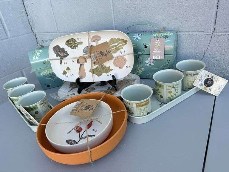 DescriptionFeast your eyes on this charming collection from Magpie Seed Co.! We have serving trays with fascinating fungal designs, adorable herb pots with matching trays for your kitchen windowsill garden, and delightful bowls adorned with botanical illustrations. You may not find a golden ticket, but these pieces are sure to bring a touch of whimsy to your kitchen. See photos for condition and details.