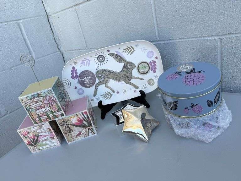 DescriptionBehold, a collection so eclectic, it practically curates itself! We've got a trio of delightful floral-themed note holders, ready to bring a touch of whimsy to your desk or countertop. Next, a Magpie decorative tray. Finally, round Flora tins, because who doesn't need a stylish place to stash their secrets (or cookies, we won't judge). See photos for condition and details.