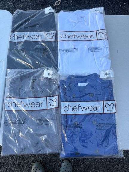 Five brand new Chefwear chef shirts still in original packaging and ready to work. Includes colors black, white, gray, and blue. See photos for condition and details.