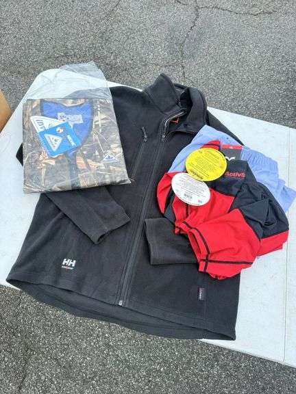 DescriptionBehold, a treasure trove of apparel awaits! This medley of garments includes a Helly Hansen fleece jacket (size XL/TG), a camo vest, an ActivSkin shirt, and a pair of light blue Ultimate Gear shorts, ready to outfit you for various adventures. See photos for condition and details.