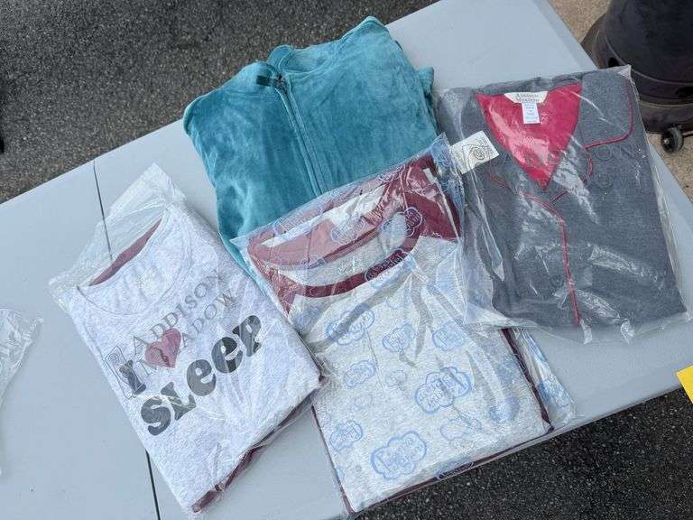 Get ready for a slumber party with this bundle of fun! Included in this lot are three sets of ladies' large pajamas and one zip up. See photos for condition and details.