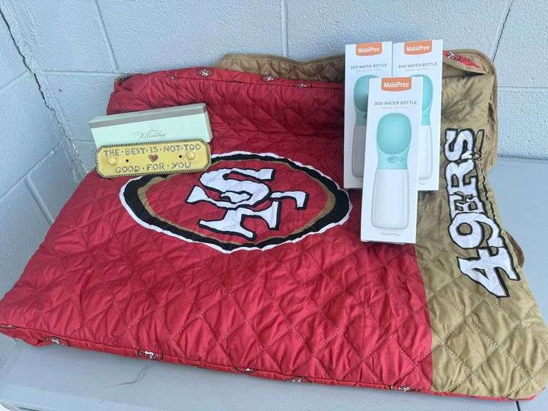 DescriptionCalling all collectors and pet enthusiasts! This lot features a trio of MalsiPree dog water bottles, perfect for keeping your furry friend hydrated on the go. As an added bonus a decorative wall hanging leash holder from Williamsburg, and a crate cover depicting the logo of the San Francisco 49ers. See photos for condition and details.