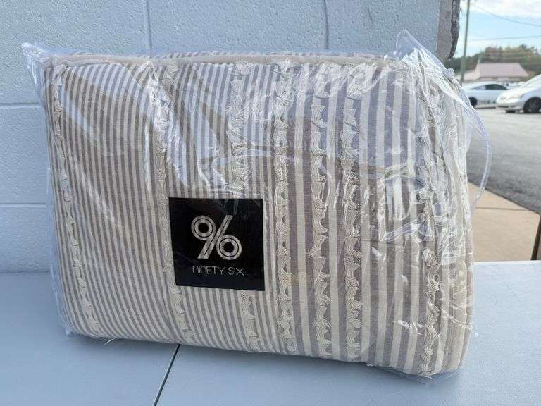 DescriptionTake a peek at this Ninety Six Queen-sized comforter set in beige and chocolate stripes! Still sealed in its packaging, this could be your chance to grab a snuggly bargain. What's inside? Well, that's up to you to discover when you unbox it! See photos for condition and details.