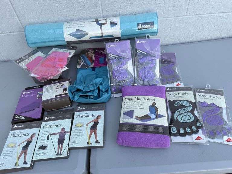 DescriptionGet your zen on! This fitness set includes a variety of Spirit TCR yoga and exercise accessories. Included are yoga mat and towel, yoga socks and gloves, flatbands in various resistance levels, yoga blocks, and mat bag. It's a whole yoga studio in one auction lot! See photos for condition and details.