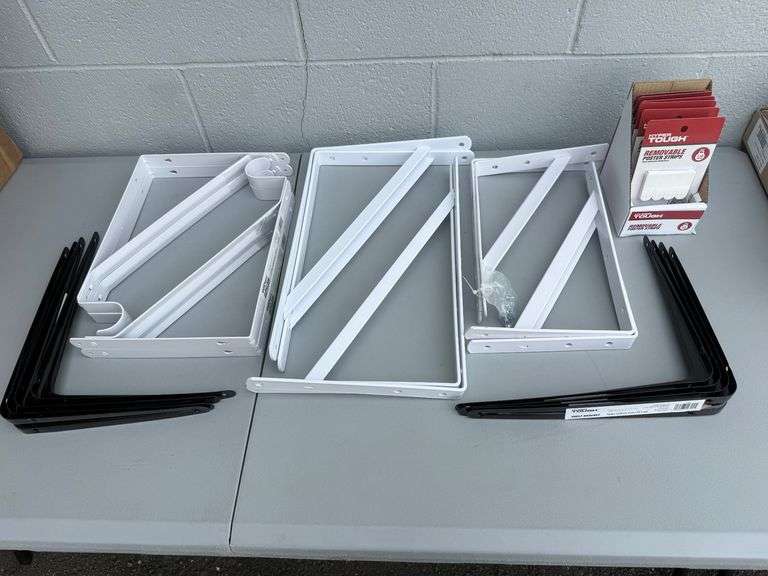 DescriptionCalling all DIY enthusiasts and organizational wizards! Up for grabs is an assortment of shelf support goodies, perfect for turning your space into a haven of stylish storage. Feast your eyes on an exciting mix of white and black shelf brackets, rod hangers for closet dreams, and even a box of poster strips for those lighter-than-air decorating projects. See photos for condition and details.